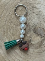 Cute reindeer keychain made with faux pearls finished off with tassel.